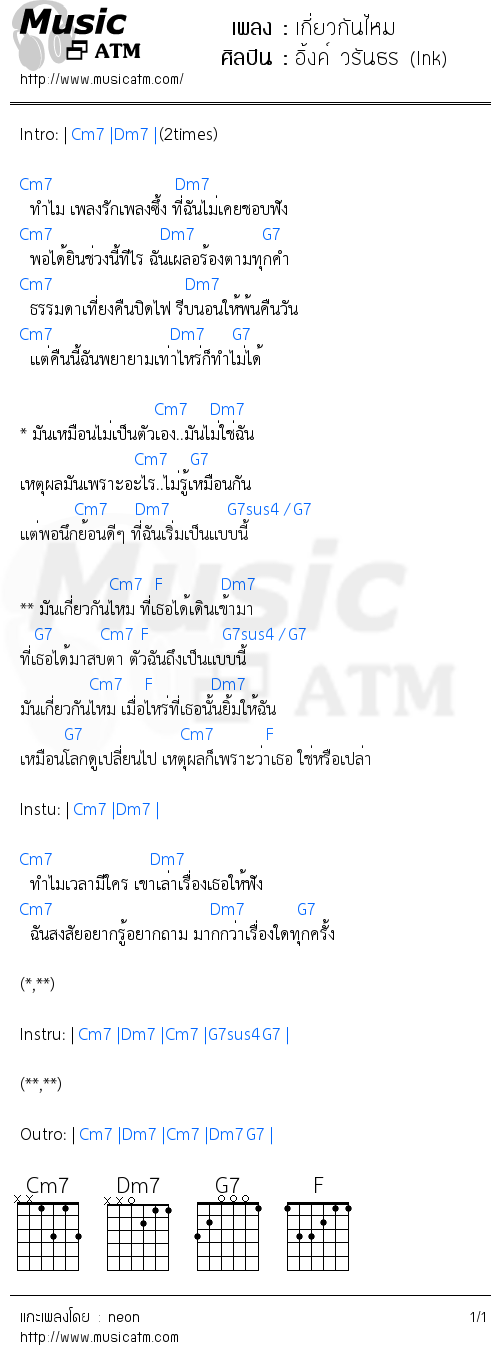 Source: www.musicatm.com เกี่ยวกันไหม อิ้งค์ วรันธร คอร์ด คอร์ดเพลง คอร์ดกีต้าร์ ฟังเพลง เนื้อเพลง มิวสิควีดีโอ กดที่นี้เพื่อ ดู คอร์ด เกี่ยวกันไหม อิ้งค์ วรันธร .